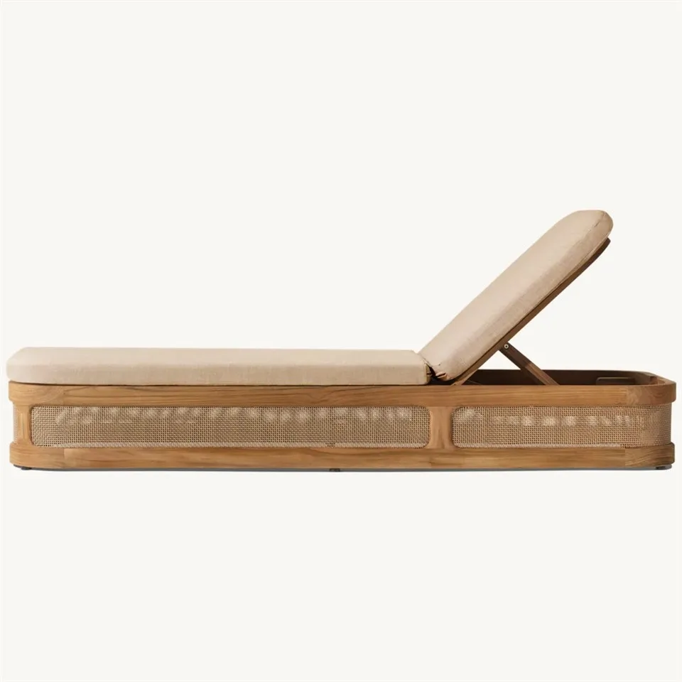 Denne moderne chaiselong i flet kombinerer moderne minimalistisk design med klassikere og er en kollision af innovation og tradition. Designet af denne loungestol er både klassisk og moderne, og teak-strukturen lægger grunden til en følelse af mode. Sammen med det håndvævede fletnet er det udsøgt, ensartet i tæthed, fladt i tykkelse, stærkere og mere elastisk, idet der tages hensyn til både skønhed og praktisk, ikke kun visuelt præsenterer et rigt lag af vekslende virtuelt og ægte, men også stigende åndbarhed. Selv i et fugtigt miljø kan flettet tørres hurtigt i tide for at sikre komforten ved brug.